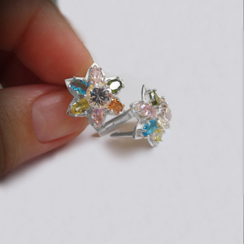 Літні срібні сережки з ювелірного комплекту Квіти у вигляді двох квіточок з пелюстками-камінчиками різних кольорів і білої серединкою. Яскраві і привабливі літні сережки вдало доповнять ваш ефектний образ, а для його доповненності підберіть собі й не менш яскраву каблучку потрібного вам розміру. Тим більше, що за умови замовлення всього комплекту повністю діє постійна знижка у розмірі 5% від вартості виробів.