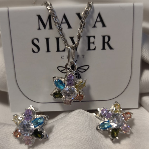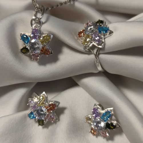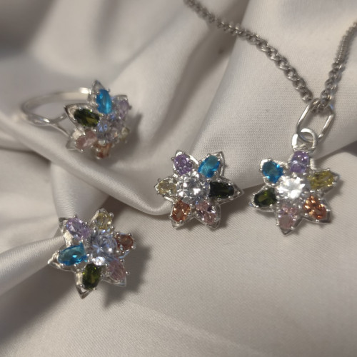 Оригінальний срібний комплект Квіти з різнокольоровим камінням - каблучка і..
