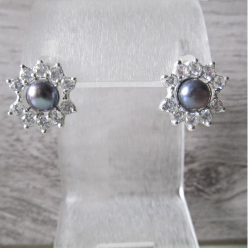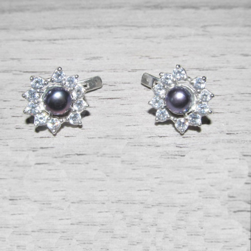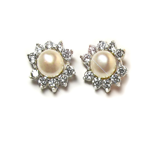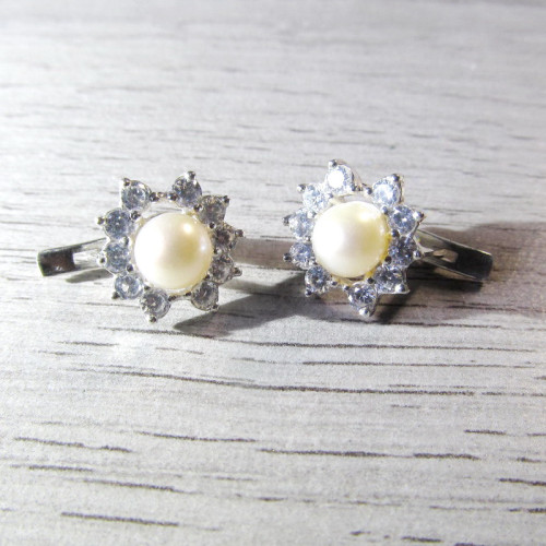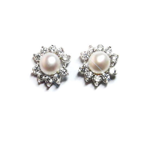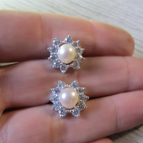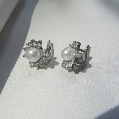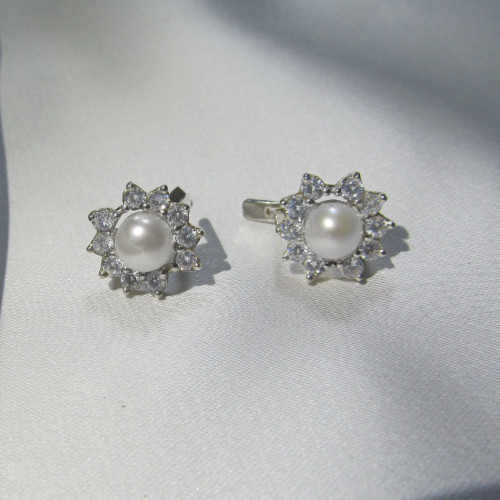 Невеликі симпатичні сережки з культивованими перлами і кубічними цирконами білого кольору зі срібла 925 проби недорого від виробника в Україні. Надійний англійський замок, натуральні річкові перли, які досить стійкі до зовнішніх впливів - не витираються, не обдираються, за властивостями ідентичні натуральним